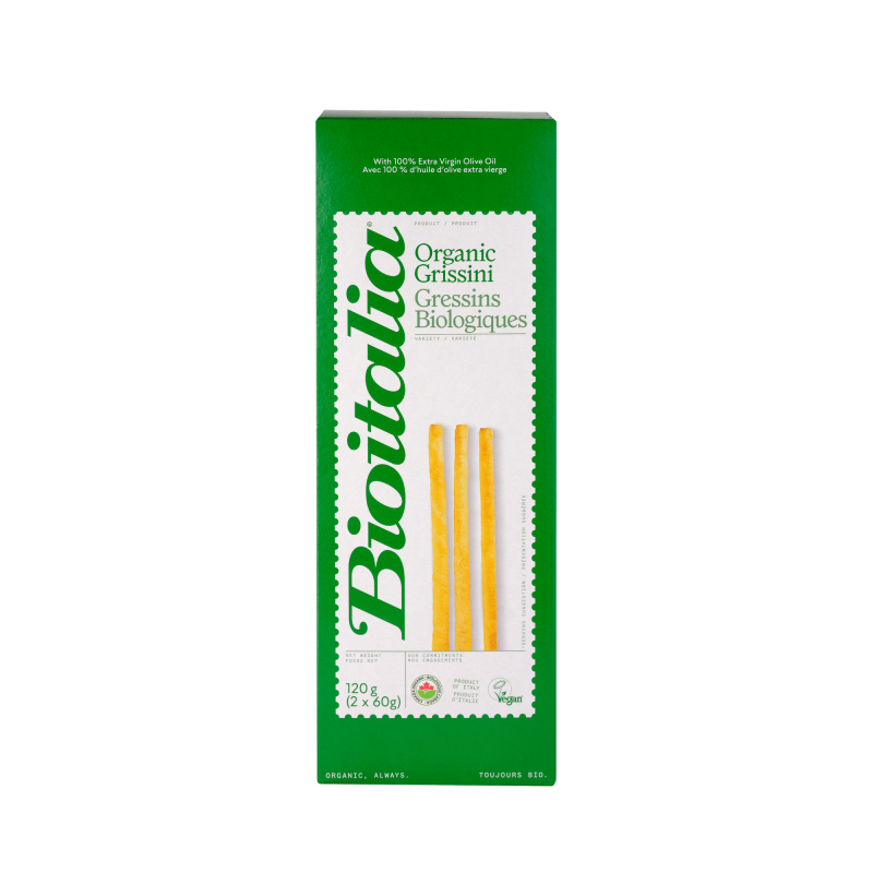 Savourez le plaisir des grissini, que ce soit pour une collation rapide, un accompagnement pour des charcuteries, ou pour déguster une pâte d'olives. Découvrez notre sélection de grissini biologiques, entièrement fabriqués en Italie. Chaque ingrédient est cultivé avec soin et éthique, respectant les travailleurs, la terre et l'environnement, tout en évitant l'utilisation d'additifs chimiques, de fertilisants artificiels et de pesticides polluants, préservant ainsi l'authenticité du produit et votre santé. Faites le choix responsable pour votre bien-être et celui de la planète avec Bioitalia. Tous nos produits sont contrôlés et conformes aux normes de production biologique européennes et canadiennes, garantissant le respect des standards de qualité et environnementaux les plus stricts.