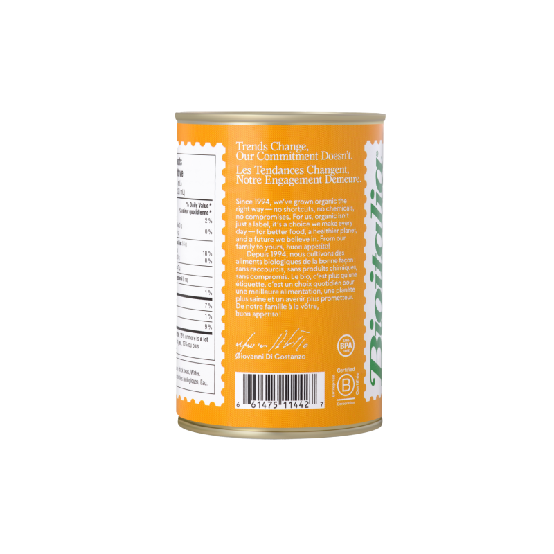Nos légumineuses en conserve sont cultivées en agriculture biologique, avec un œil attentif concernant la protection de l’environnement et la qualité du produit. Elles sont conditionnées dans des conserves sans BPA. Étant donné l’alerte lancée par le marché international et les dernières réévaluations de l’Autorité européenne de sécurité des aliments concernant la sécurité relative BPA qui réduisent considérablement le seuil journalier tolérable de cette substance, Bioitalia a décidé de ne pas en utiliser dans ces produits, bien qu’ils aient toujours été sans danger. De plus, cette préparation présente plusieurs avantages : nous n’ajoutons pas de sel à l’eau de cuisson. Les légumineuses sont blanchies à 80 °C. Lorsqu’elles sont encore chaudes, nous les mettons dans les conserves et nous les stérilisons à 121°C, afin de créer un vide dans la conserve. Pas besoin d’ajouter de sel pour leur conservation.