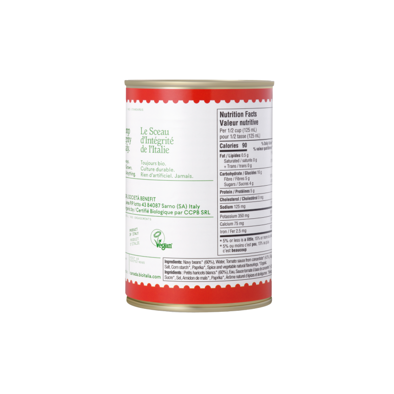 Petits haricots blancs biologiques, eau, concentré de tomates biologiques, sucre de canne biologique, sel, amidon de maïs biologique, paprika biologique, arômes naturels.