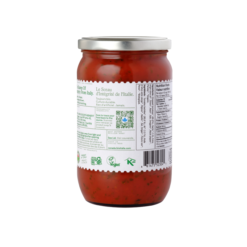 Les sauces biologiques prêtes à l’emploi Bioitalia sont élaborées à partir de recettes simples, tout comme celles faites maison. Sans additifs ni ingrédients compliqués. Les tomates et l’huile d’olive extra vierge sont enregistrées sur la blockchain; vous pouvez ainsi suivre toutes les étapes de production de la ceuillette de la tomate au produit fini. Nous cuisinons nos sauces biologiques selon la tradition italienne, en ajoutant la juste dose de sel et en faisant délicatement sauter l’ail et les oignons en début de cuisson. Avec nos sauce biologiques prêtes à l'emploi, il est facile de préparer un repas en quelques minutes, sans pour autant renoncer à la qualité d’une sauce faite maison. Tout est vraiment BON dans cette sauce.