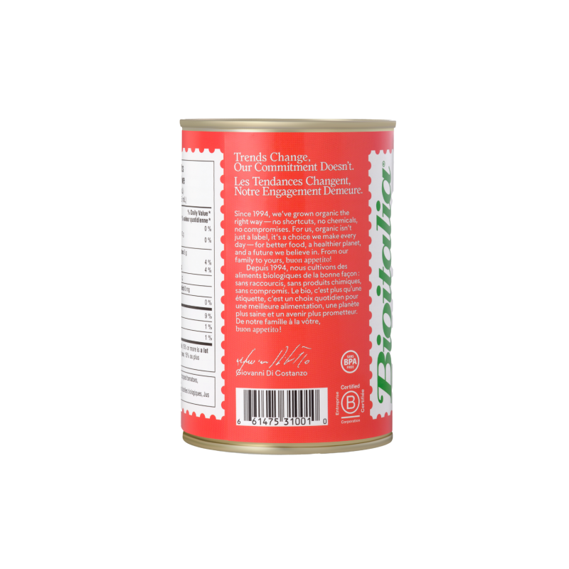 Les tomates hachées Bioitalia : de beaux gros morceaux qui unissent parfaitement le jus de la tomate avec la pulpe. Sans sel ajouté.