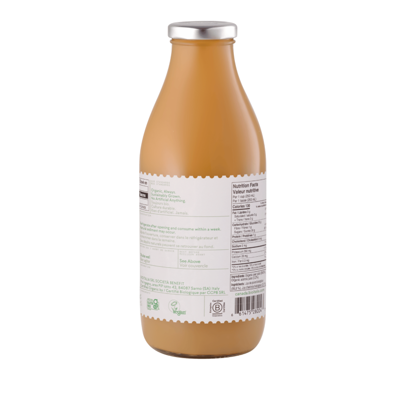 This organic pear juice is made from certified organic pears.