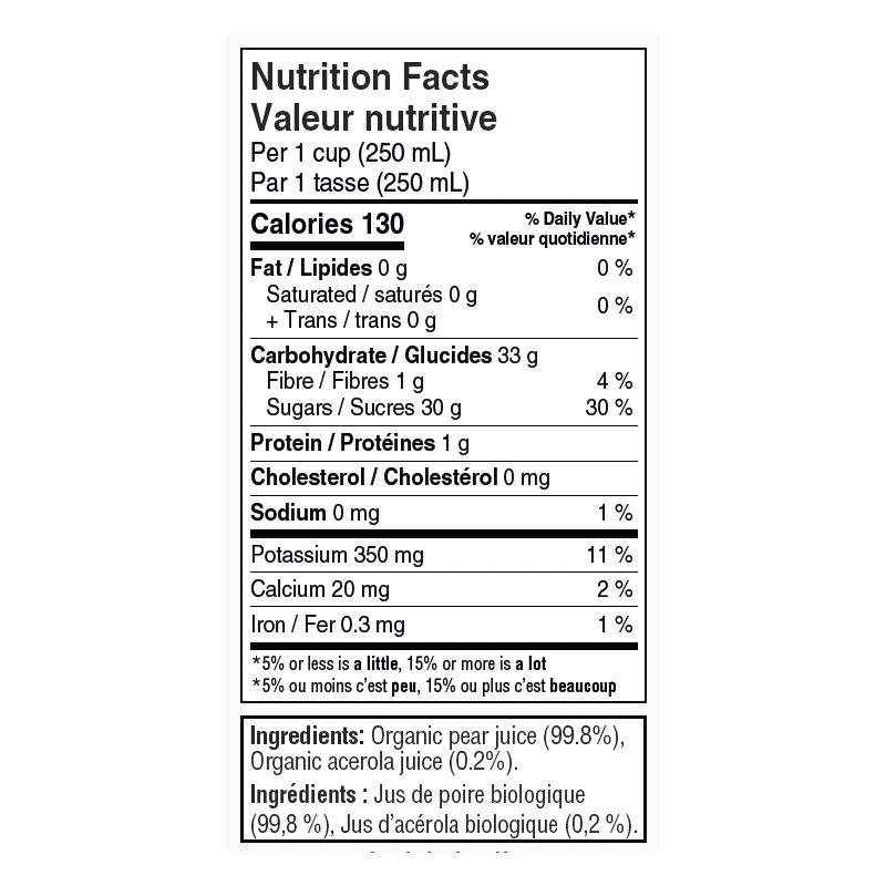 Organic pear juice 99.8%, Organic acerola juice 0.2%.