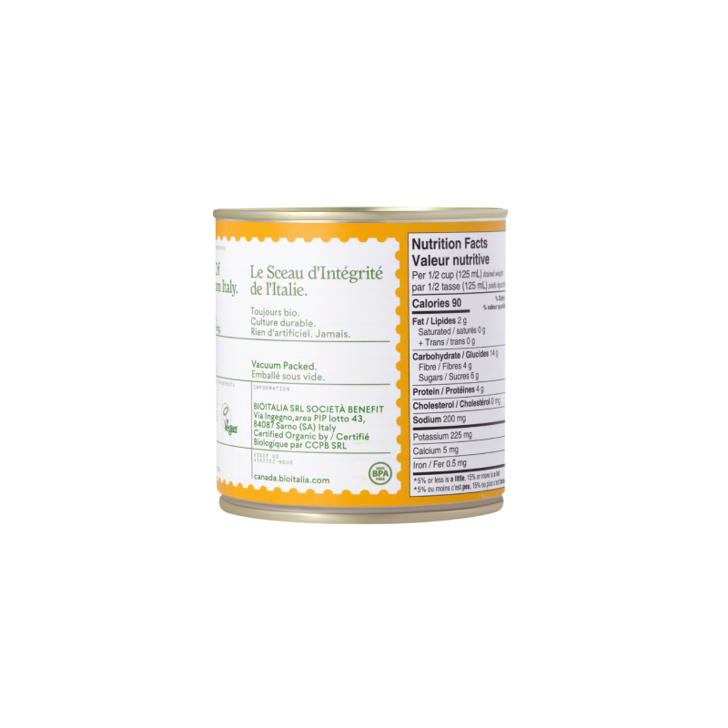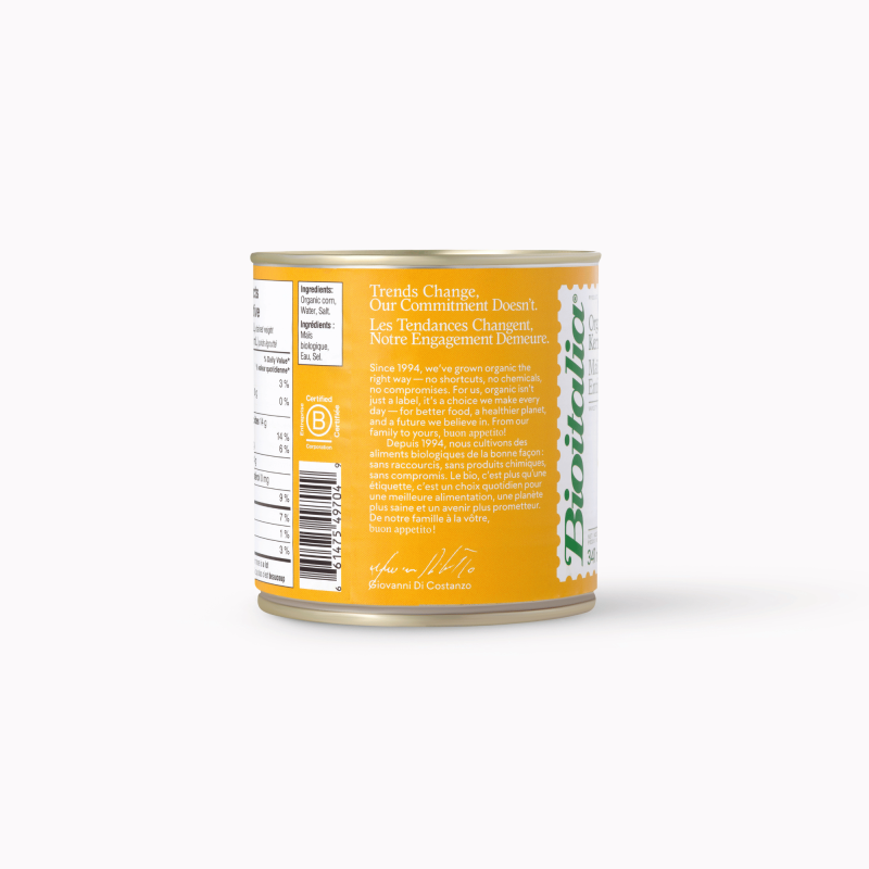 Our corn kernels are grown using organic methods, with a focus on environmental sustainability and product quality. They are packaged in BPA-free cans. Given the international market alerts and the recent reassessment by EFSA of BPA safety, which significantly reduces the tolerable daily intake threshold, Bioitalia has decided not to use it in its products, even though they have always been safe.