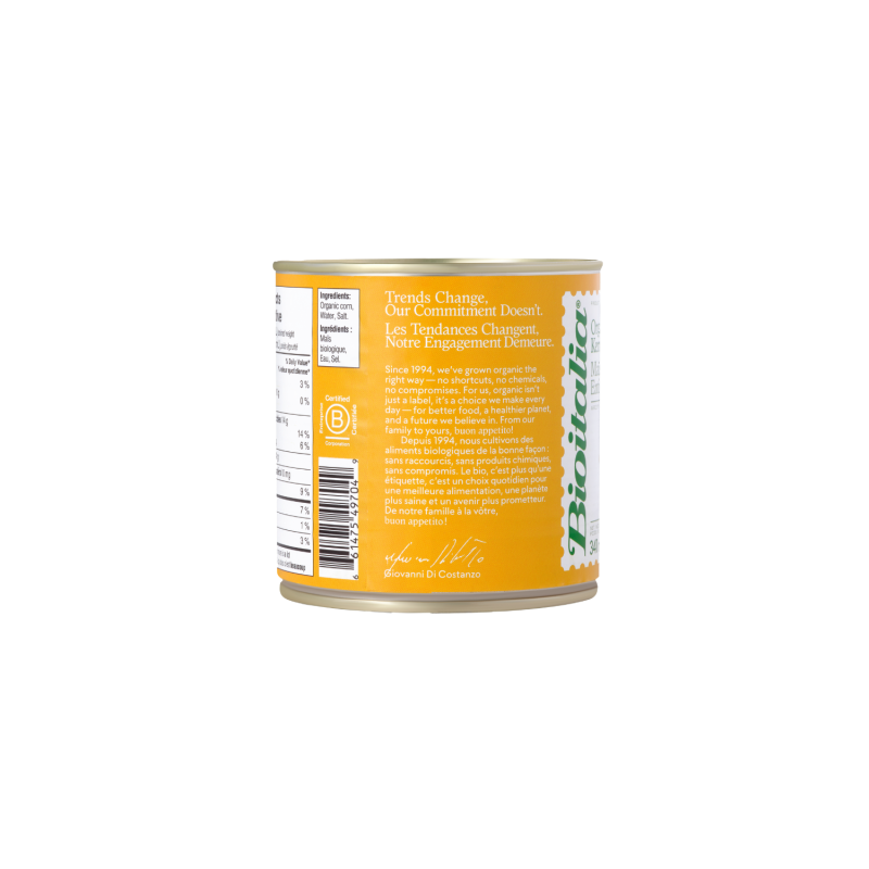 Our corn kernels are grown using organic methods, with a focus on environmental sustainability and product quality. They are packaged in BPA-free cans. Given the international market alerts and the recent reassessment by EFSA of BPA safety, which significantly reduces the tolerable daily intake threshold, Bioitalia has decided not to use it in its products, even though they have always been safe.