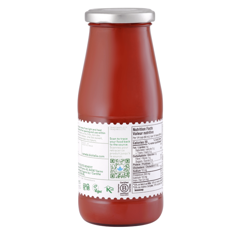 The unmistakable good smell and rich flavor of rustic tomato puree are made possible by the processing that takes place just a few hours after harvesting. Now you can follow the entire journey of our organic tomatoes thanks to a QR code you will find on the label. This allows you to personally verify all the production processes, from harvesting to bottling.